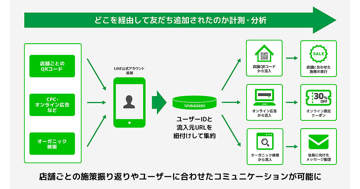 自然検索やオンライン広告など、どこを経由して友だち追加されたか特定する。店舗ごとに振り分けて設置したQRコードによる流入数の計測もでき、各店舗に合わせた施策の実行や、コミュニケーション設計も可能になる。広告からの流入にはクーポンを発行、自然検索には会員に向けたメッセージ配信といったことも可能。