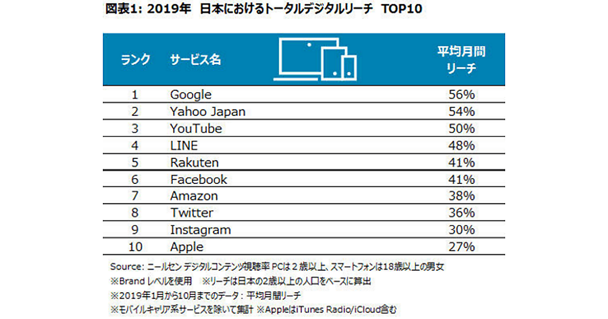 2019年の日本におけるトータルデジタルでのリーチ(日本の人口に対する利用者数)トップ10は前年から大きな変動はない。「Google」が56%で2位から1位へ、「Yahoo! JAPAN」は前年同様54%で1位から2位へ、「YouTube」は3位のまま、リーチも変わらず50%だった。トップ3の「Google」「Yahoo! Japan」「YouTube」は、日本人の過半数が毎月(月1回以上)利用していることとなる。