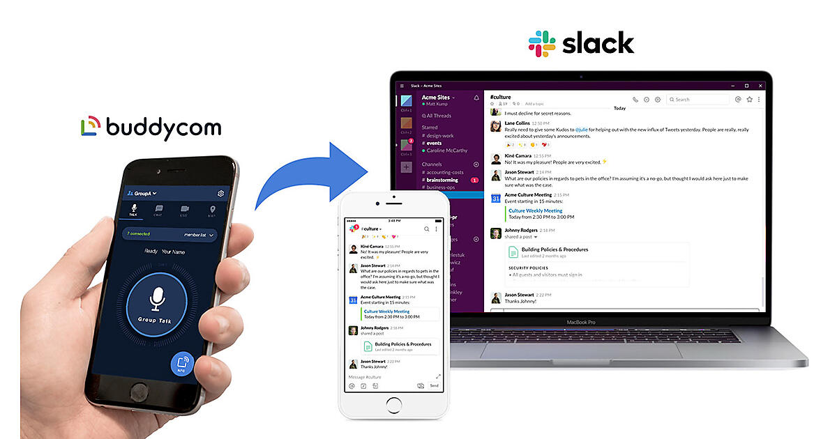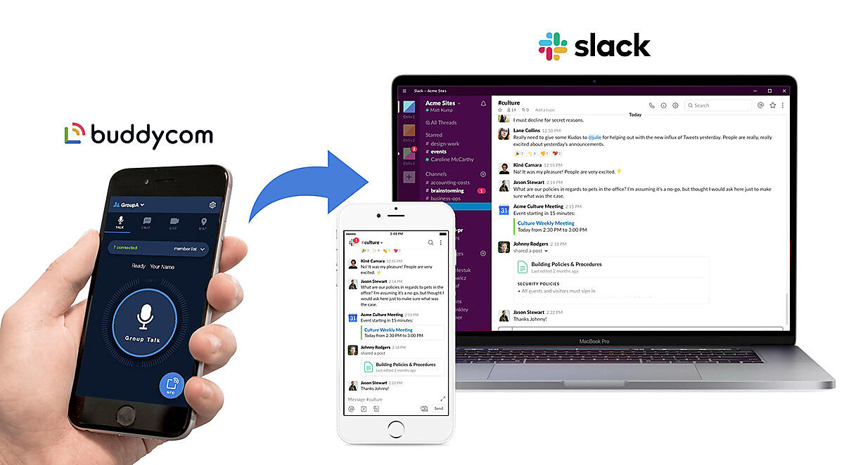 Buddycomは、話した内容をリアルタイムに文字化して共有でき、現場の業務コミュニケーションを効率化する。アプリ画面のトークボタンを押すか、スピーカーマイクなどの周辺機器を使う。Slackではこれまで、文字を打つのに時間がかかったり、業務中はスマートフォンに触れられなかったりするケースが指摘されていた。