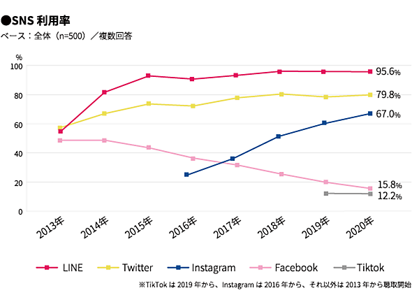 SNSの利用率は、1位「LINE」95.6%、2位「Twitter」79.8%、3位「Instagram」67.0%が上位を占めた。順位に変動はないが、3位の「Instagram」がまだまだ上昇の勢いを見せている。