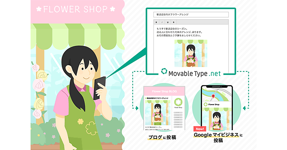 MovableType.netのGoogleマイビジネス連携機能を使うことで、コンテンツの公開から告知まで1つのサービス内で終わらせられ、オンラインでの発信と告知に関する作業が効率化できる。今後、Googleマイビジネスの投稿形式の追加や予約投稿などの機能拡張も予定する。MovableType.net全プランで追加料金なく利用できる。