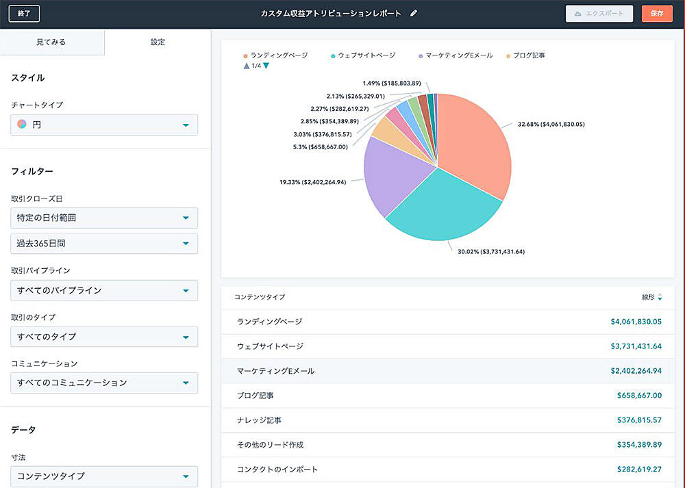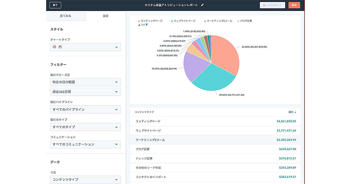 アトリビューションレポートの可視化によって、どのリード(見込み客)獲得チャネル、顧客とのタッチポイント(接点)、コンテンツが自社の収益に寄与したか一目で分かる。事前に用意された6つのアトリビューションモデルから自社に合ったものを選び、容易にレポートを作成。将来のマーケッティング投資計画に役立つ。