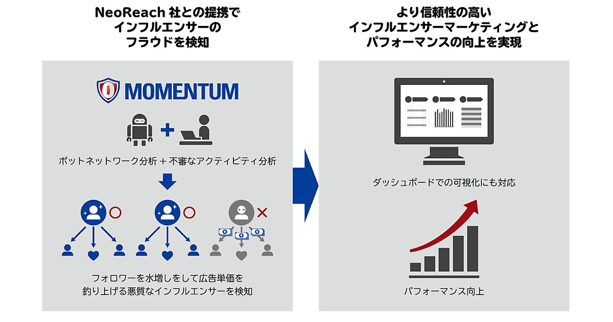 インフルエンサーマーケティング市場が世界的に拡大する半面、悪質なインフルエンサーが自らのフォロワーを水増しすることで広告単価を釣り上げる不正が発生しているため、NeoReachとの提携で検知サービスを行うことにした。Momentumはフォロワー水増しなどの不正を広義のアドフラウド(広告詐欺)と捉えている。