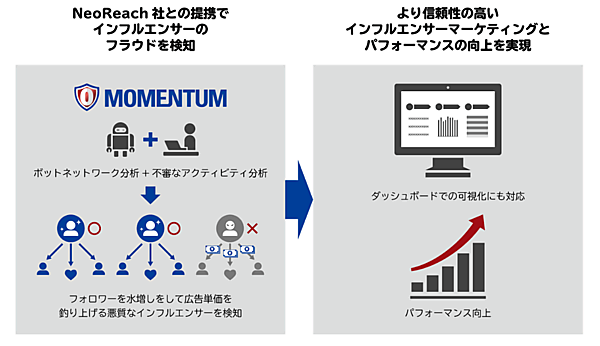 NeoReachは、インフルエンサーの詳細な情報の把握やフォロワーの属性分析が複数のソーシャルメディア横断で可能な技術を保有。同社にとって日本市場でのインフルエンサーのフラウド検知の展開は初となり、Momentumのようなアドベリフィケーション(広告の価値毀損検証と対策)提供事業者との連携は世界市場で初。