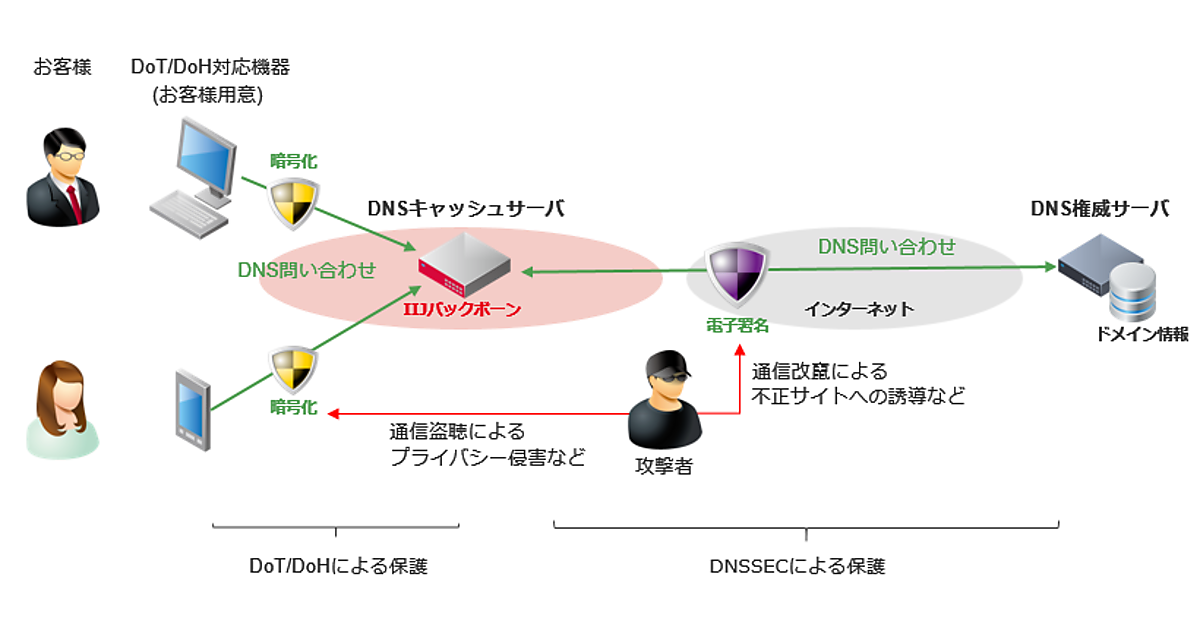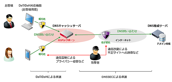 DoT・DoHは、安全な通信路のTLS/HTTPS上にDNS通信をのせ、DNSキャッシュサーバーへの問い合わせ内容を暗号化する技術となる。第三者による通信の盗聴や改ざんのリスクを低減し、プライバシーを保護する。DNSSECは、電子署名を応用してDNSの情報が改ざんされていないかを検証する仕組み。サーバーの正当性が確認できる。