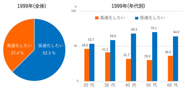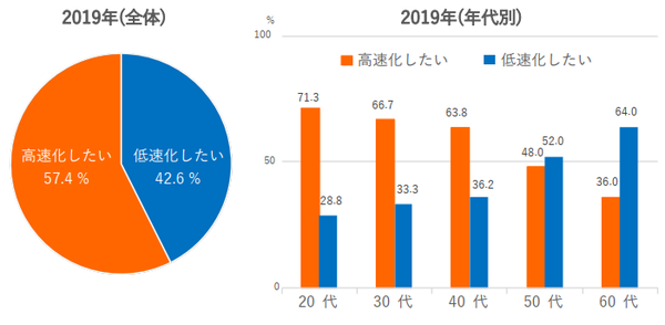 年代別で見ると、やはり若い世代ほど「高速化したい」が高いが、1999年では、すべての世代で「低速派」のほうが多かった。しかし2019年の今回調査では、20代・30代・40代で「高速化したい」が「低速化したい」を上回るようになった。
