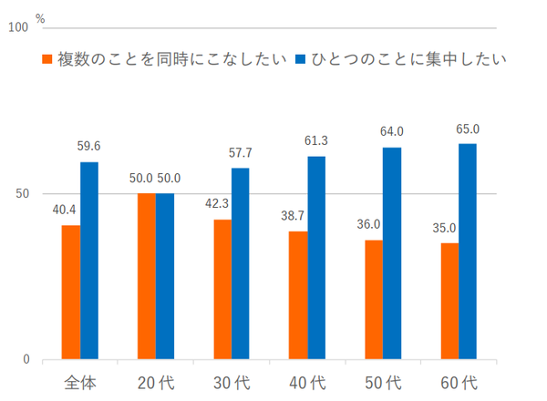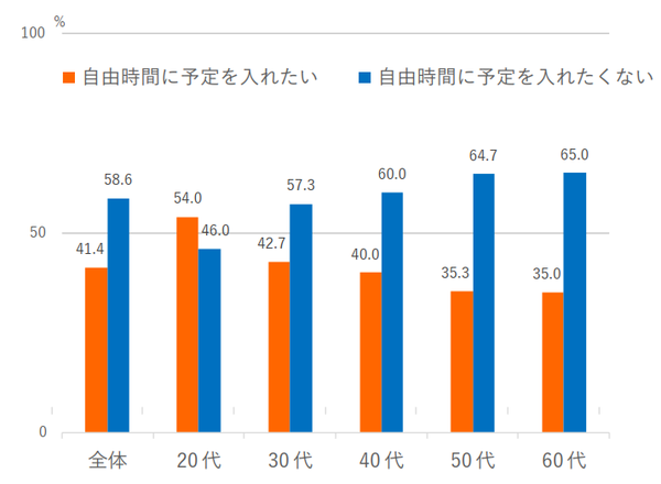 続いて、「自由時間に予定を入れたい」「物事は素早く進めたい」「複数のことを同時にこなしたい」の3項目について聞き、時間の使い方に関する欲求を計った。その結果、全体では“したくない派”が“したい派”を上回った。