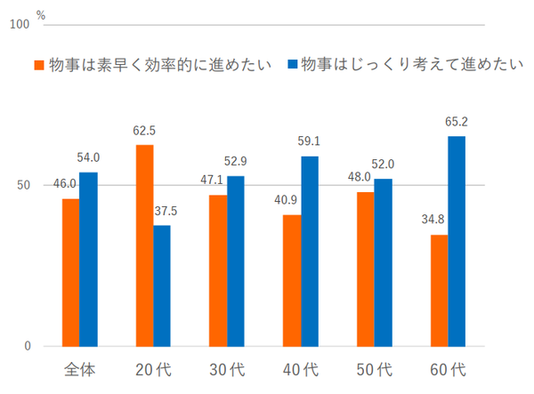 まず「あなたは日頃の行動(仕事や家事、遊びなど)を、今よりスピードアップして高速化したいですか? それとも、ゆっくりと低速化したいですか?」と聞き、生活行動に関する速度欲求を計った。その結果、「高速派」が57.4%で、「低速派」42.6%を大きく上回った。1999年の同種調査では「高速派」37.4%、「低速派」62.6%だったため、完全に逆転している。