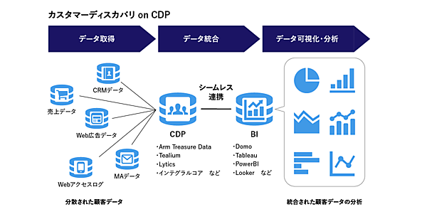 このソリューションはCDP、BIツールの選定・導入▽データフロー設計・取得・加工▽MA(マーケティングオートメーション)・CMS(コンテンツマネジメントシステム)・広告など各種マーケティング技術との連携▽ダッシュボード構築--の一連の業務でCDPとBIを継ぎ目なく連携。顧客データを戦略的に生かせるようにする。