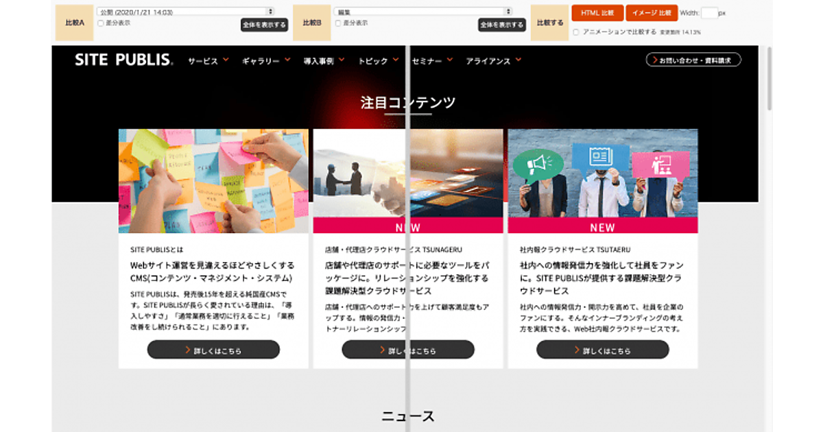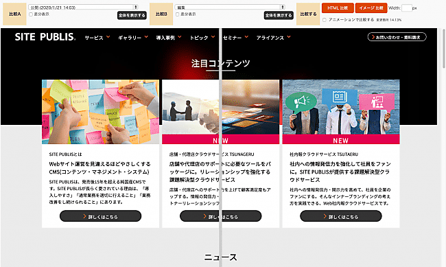 この機能は、ウェブページ承認者向けに見た目で比べる「イメージ比較」と、ページ編集者用にHTMLソースコードの差分比較を行う「HTML比較」があり、ページ公開前に編集前後のページを画像比較とHTML比較の両方で可能。これまでは公開中のページと修正したページの画面をその都度、個々に開いて見比べる必要があった。