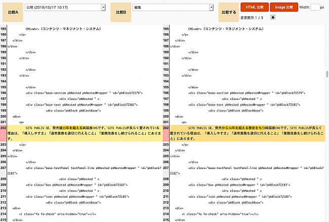 ウェブ関連製品・サービス企画・開発のサイト・パブリスは、同社のCMS(コンテンツマネジメントシステム)「SITE PUBLIS」の新版「SITE PUBLIS 4.7.0」の提供を2月3日に始める、と1月23日発表した。ウェブページの更新・差分が直感的にチェック可能な「ページ変更履歴比較表示機能」を搭載した。国内CMSで初という。