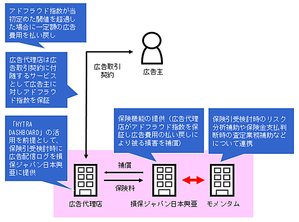 補償の対象はアドフラウド保険の契約をした後の広告費用。保険への加入には、広告代理店がアドフラウドを抑制して継続的にリスクを可視化・分析する必要があることから、モメンタムのアドフラウド対策サービス「HYTRA DASHBOARD 3」の活用が前提になる。両社は今後、多くの広告に適用できるように条件を拡張する。