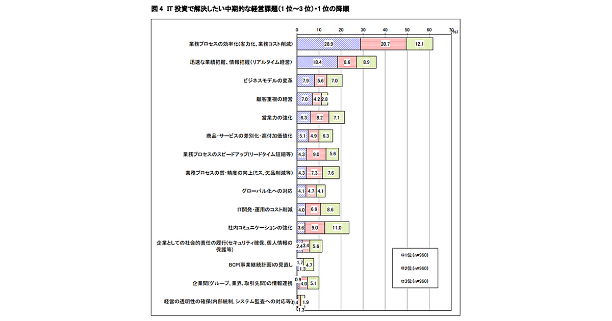 「IT投資で解決したい中期的な経営課題」について選択式で聞くと、「業務プロセスの効率化(省力化、業務コスト削減)」が60%を超えて、前回に続き断トツの1位。2位には「迅速な業績把握、情報把握(リアルタイム経営)」が続いた。なお3位「ビジネスモデルの変革」(前回4位)、4位「顧客重視の経営」(前回9位)はランクを上げており、経営課題の変化を感じさせる。