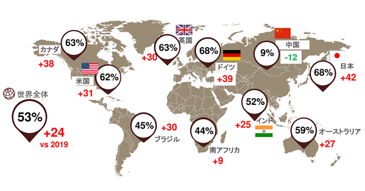 特に日本のCEOは、2019年調査(前回)の27%から「減速する」の回答が68%まで上昇し、世界的にもっとも高い数値を示した。逆に「改善する」と回答した日本のCEOは12%で、2019年の33%より21ポイントも下降している。世界情勢に加え、国内の状況を楽観視していない様子がうかがえる。なお海外を見ると、中国のCEOのみ「改善する」が伸びており、84%が「改善する」と強気のポジティブ予想を回答している。