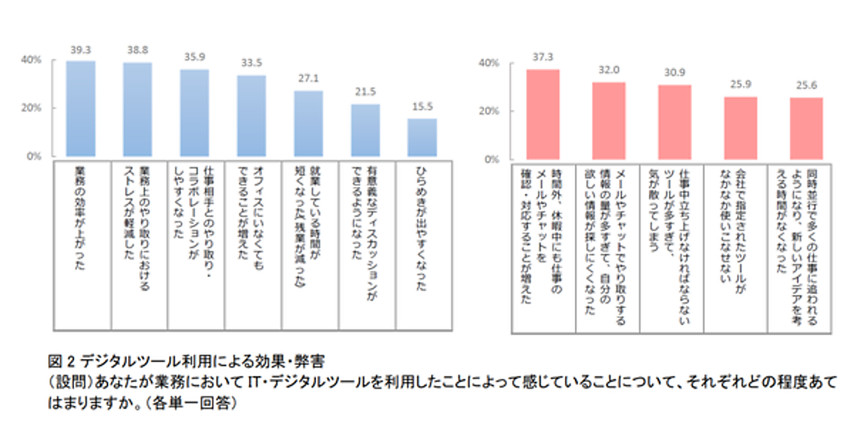 一方で「業務時間外のメール・チャット対応が増えた」37.3%、「欲しい情報が探しにくい」32.0%、「ツールが多すぎて気が散る」30.9%といった声も多く、“コラボツールやコミュニケーションツールのせいで、集中しにくい”という弊害が起きているようだ。この割合は、ツールを積極的に使っている20代~30代の層が強く感じていた。デジタルツールの利便性を強く体感しつつも、集中して業務に取り組むことが困難になっている現状が浮き彫りになったと言えるだろう。