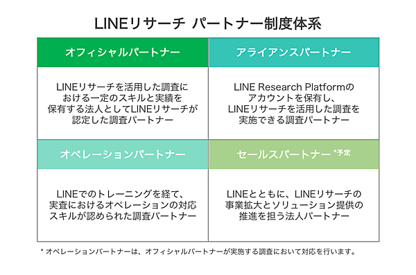 LINEリサーチを活用した調査ができる会社を従来通り「アライアンスパートナー」とし、その中でLINEリサーチでの調査で一定のスキルと実績を持つ会社を「オフィシャルパートナー」に認定。一部に限っていた調査メニューとノウハウの連携範囲を広げる。これによってクライアントはニーズに応じた多様な調査が可能になる。