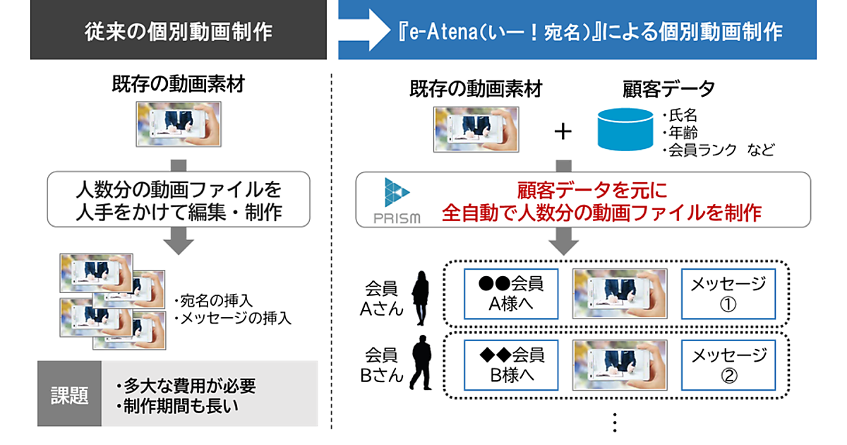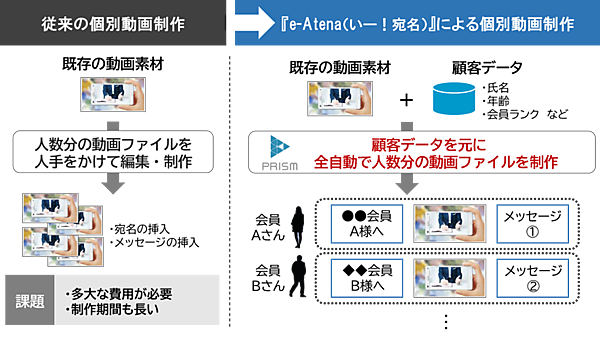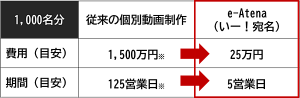 特定の顧客や取引先に合わせた動画を提供する1対1のマーケティングニーズが増える半面、それぞれに最適化した動画制作には莫大なコストと時間がかかることが課題だった。長さ2分間のファイル容量30MBの動画1000人分の場合、従来だと1500万円の費用が必要になるが、e-Atenaは25万円ですみ、期間も大幅に短縮できる。