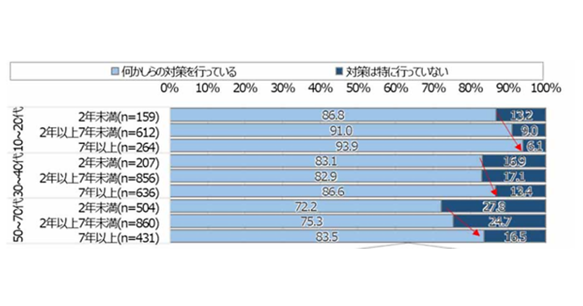 まず「何年前からスマホを利用しているか」(スマホの利用年数)を聞くとともに、「何らかのセキュリティ対策を行っているか」を聞いた。その結果、年齢にかかわらず、スマホの利用期間が長い人ほど、セキュリティ対策の利用率もあがっていた。「2年未満」の人に対し「7年以上前」から利用している人だと、対策を行っていない人はほぼ半減する。