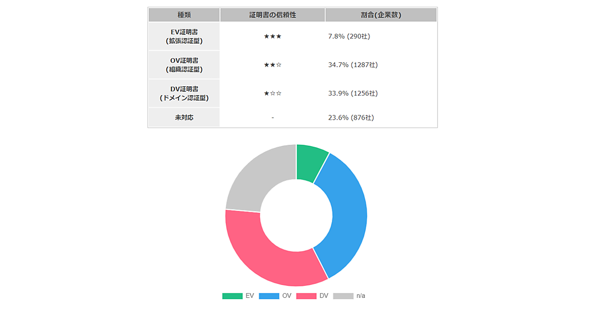 常時SSL化で必要となるSSL証明書について、「EV証明書(拡張認証型)」「OV証明書(組織認証型)」「DV証明書(ドメイン認証型)」の、3つのサーバ証明書の種類ごとに見ると、EV証明書を使用していたのが290社(7.8%)、OV証明書が1,287社(34.7%)、DV証明書が1,256社(33.9%)、未対応が876社(23.6%)だった。
