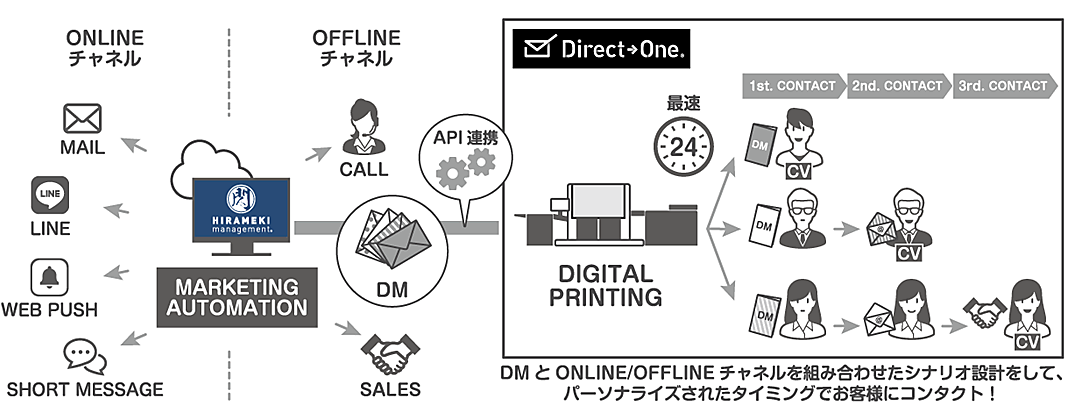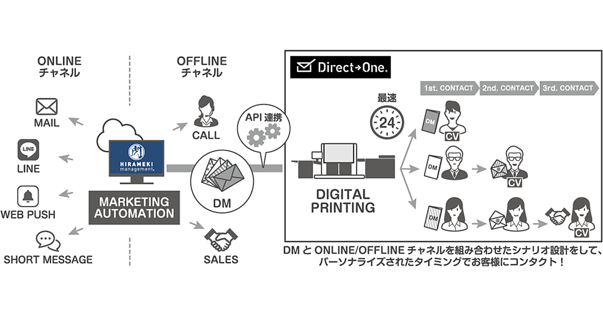 OMO(Online Merges with Offline)ソリューションとなる。OMOは、オフラインビジネスとオンラインと一体に捉えたマーケティング概念で、「オン」と「オフ」を柔軟に組み合わせたアプローチを重視する。HIRAMEKIとDirect→Oneを連携することで、手作業だったリスト生成とメール原稿の入稿を自動化。発送までの時間を短縮して最速24時間以内に投かんする。デジタルのマーケティングだけでは届かない潜在顧客にDMでアプローチできる。