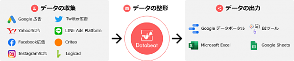 自動収集可能な広告プラットフォームはGoogleのほか「Yahoo!」「Facebook」「Instagram」「Twitter」「LINE」など。同じ意味でも各社が違う指標として扱うデータも整えて保存する。データはGoogleの無料ダッシュボード「Googleデータポータル」や「Excel」「Google Sheets」、各種データ収集・分析ツールに出力できる。