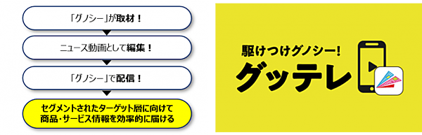 グッテレは、グノシーの利用者になるニュースなどの社会トレンドに興味がある若年層から高齢層までの男女を想定する。タブの選択や年齢・性別・居住地などターゲットを絞って効果的に広告動画を届ける。グノシーが取材し、商品やサービス、開発秘話や使用レビューなど、情報番組のように気楽に視聴できるコンテンツに仕上げるという。