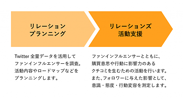 ブランドに好意的でフォロワーの意識・態度・行動変容に影響を与えるユーザーを調べ、ブランドとの関係構築からフォロワーへの影響度の効果測定までを行う。Twitterデータの全量を分析し、ブランドに愛着を持つ影響度が大きいファンインフルエンサーの発見と、コミュニケーション管理、購買影響度の測定を実施する。