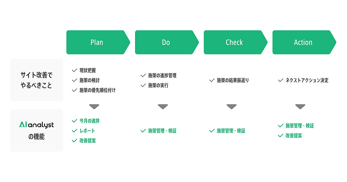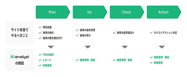 サイト改善PDCAの実施にはP=サイトの現状把握、施策の検討・優先順位付け▽D=施策の進捗管理、実行▽C=施策結果の振り返り▽A=次の行動決定--の各ステップが必要。新搭載機能を含むAIアナリストの各機能を活用することで、ステップに応じてPDCAがスムーズに進められるようになり、AIアナリストでPDCAが完結できる。