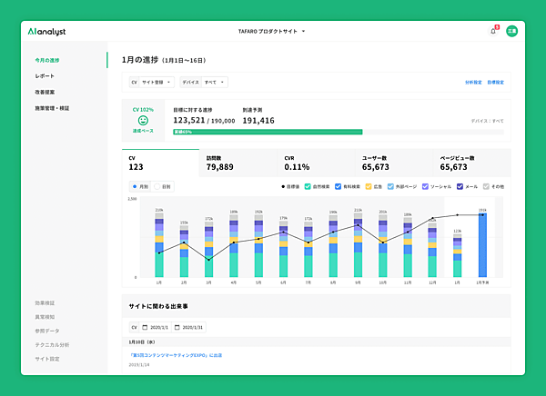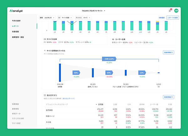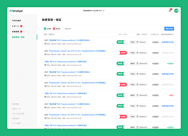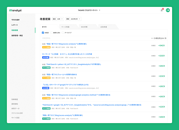 AIアナリストは、Googleのアクセス解析サービス「Google Analytics」のデータを基に人工知能がサイトを分析し、改善を自動提案する。従来は「改善提案」機能の「施策のレコメンド/優先度付け」が中心だった。今回「サイトの状況把握」「施策の進捗(しんちょく)管理」「実施施策の結果確認/考察」の支援機能を加えた。