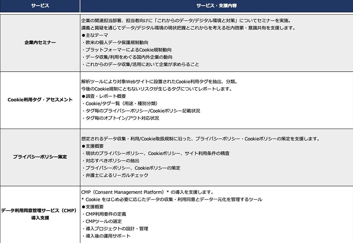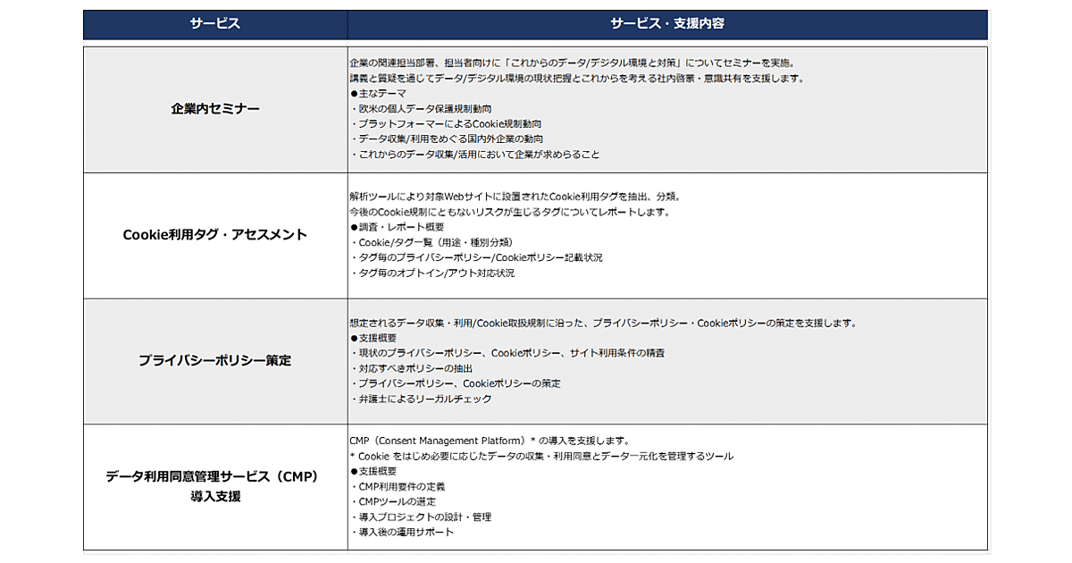当初は、企業内セミナー▽クッキー利用タグ・アセスメント▽プライバシーポリシー策定▽データ利用同意管理サービス導入支援--を提供する。クッキー利用タグ・アセスメントは、対象ウェブサイトに設置されたクッキー利用タグを抽出・分離し、今後の規制でリスクが生じるタグを報告する。支援の範囲は今後拡張する。