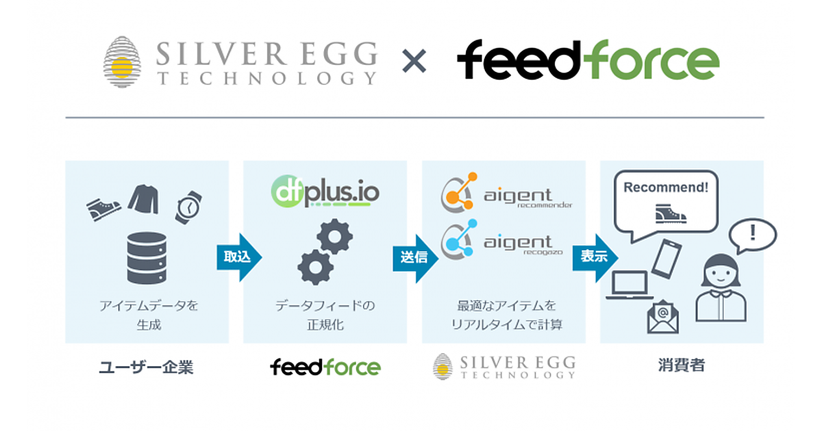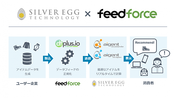 AI(人工知能)技術を基にしたデジタルマーケティングサービス事業のシルバーエッグ・テクノロジーは、同社のAI搭載レコメンドサービス「アイジェント」をデジタルマーケティング支援事業のフィードフォースが展開するデータフィード管理ツール「dfplus.io」に正式に対応させた、と2月13日に発表した。サービスを始めた。