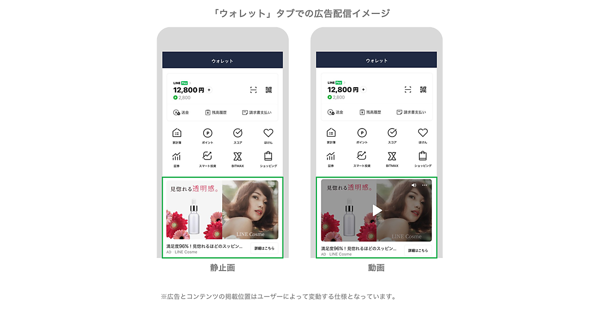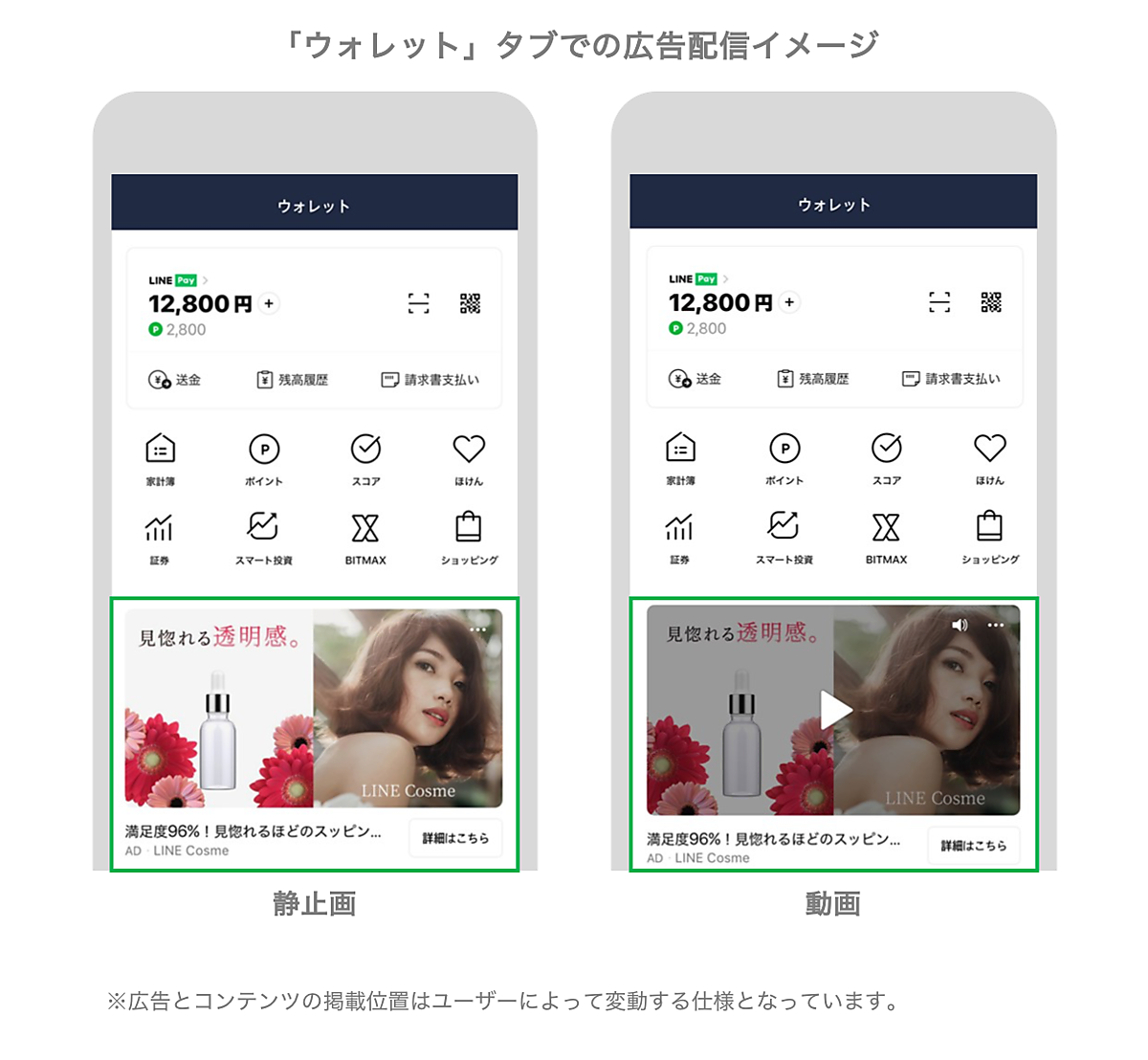 LINEウォレットタブは、LINE内でおカネのやり取りを一元化した窓口で、メインとなるモバイル送金・決済サービス「LINE Pay」や「LINEポイント」「LINEクーポン」のほか「LINEほけん」「LINE家計簿」「LINE証券」などの金融サービスへの入口もあり、月間利用者数は5400万超という。ここに広告を表示すると幅広いLINEユーザーにリーチできる。