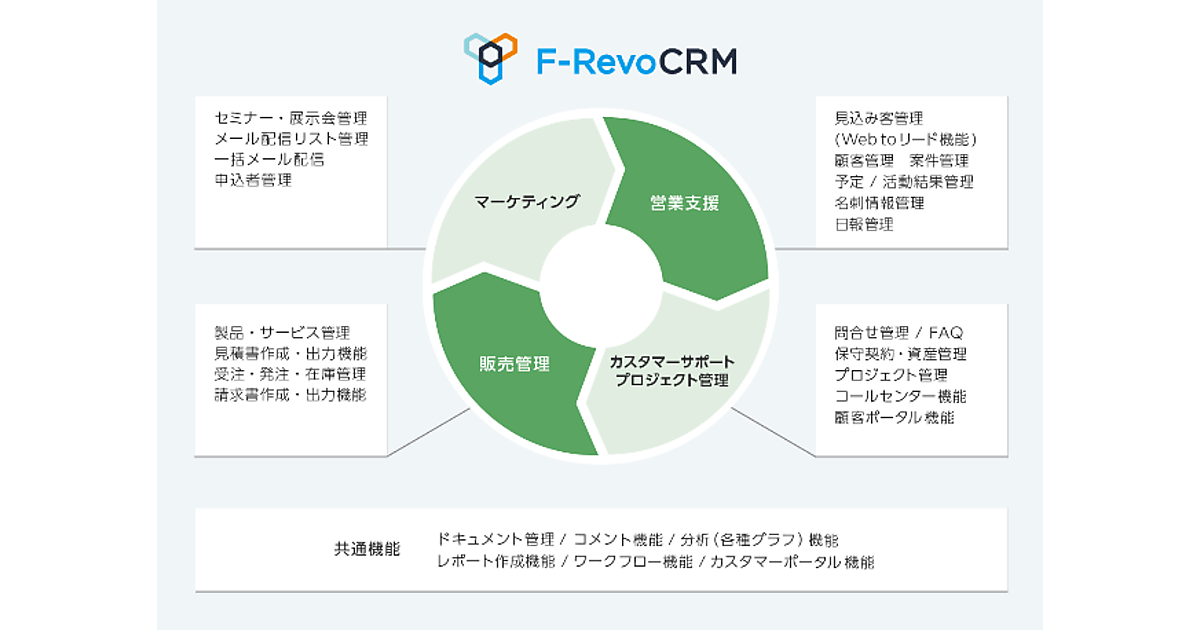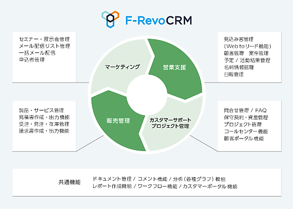 F-RevoCRMは、マーケティング▽営業支援▽問い合せ管理▽販売管理--などの機能がある高機能なCRMで、業界や企業規模を問わず使える。オープンソースのため、各種システムとの連携やアドオン開発も容易になる。ライセンス数による課金がなく低コストで構築でき、CRMを初めて導入する企業でも気軽に活用が可能。