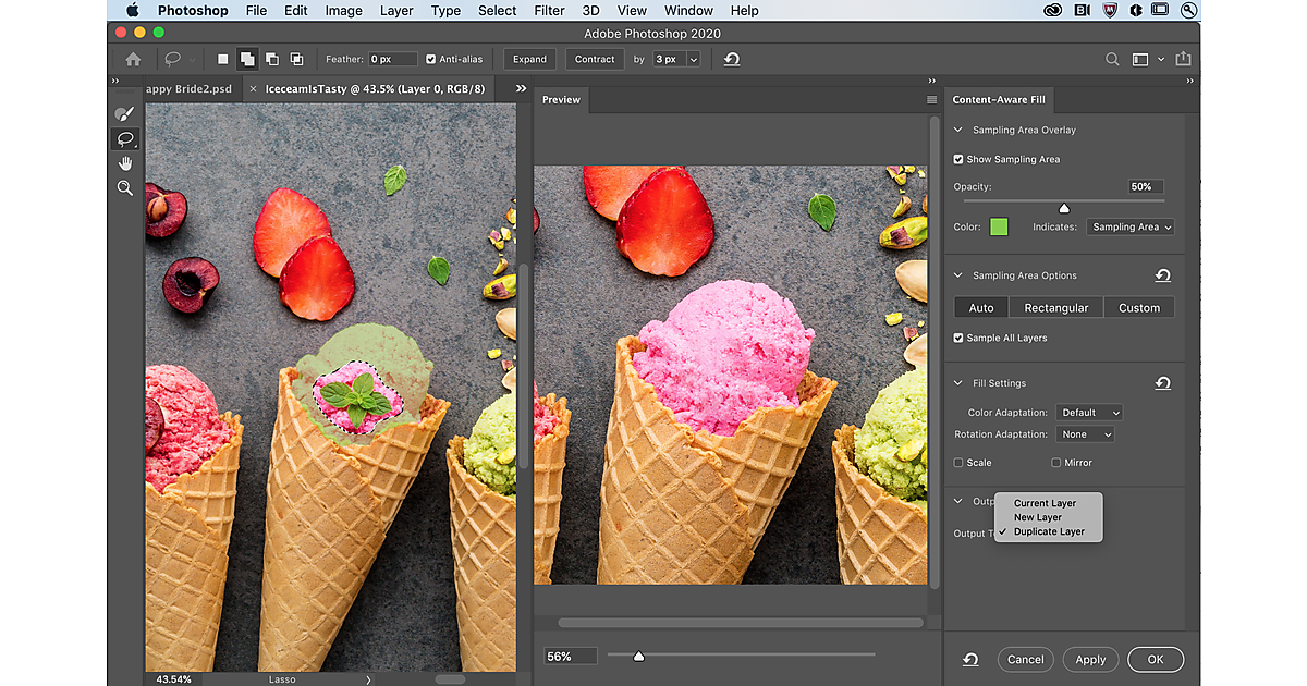 デスクトップ版では「コンテンツに応じた塗りつぶしのワークスペース改善」を導入した。植物の枝が重なり合っているような背後の被写体を消す場合の作業を改善する。ワークスペースを離れずに複数の選択範囲をつくって、複数の塗りつぶしに適応した。作業の細かな調整や試行を繰り返して、より自然な塗りつぶしができる。
