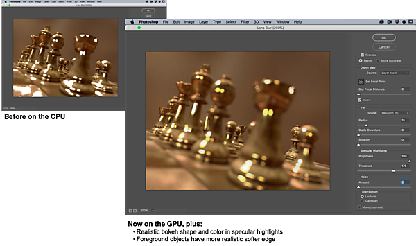 「ぼかし(レンズ)の強化」では、深度情報を持たない平面画像にピンぼけ効果を後から加える加工を改善。処理速度も向上した。写真の前景や背景にぼかしを入れながら、全体的に自然な画質になるよう大幅に改善している。