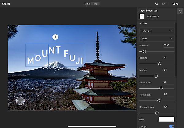 さらに、デスクトップ版で使い慣れた「文字の書式設定」の多くがiPad版にも搭載された。テキストレイヤーのプロパティに文字関連のオプションとプロパティが追加され、トラッキング▽行送り▽垂直比率/水平比率▽上付き文字/下付き文字などが加わった。