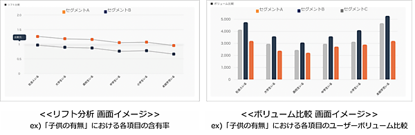 セグメント作成機能は視覚的に条件選択できるよう変更し、複数の集合の関係を図で表すベン図で条件指定可能な「簡単モード」を設けた。「詳細モード」はこれまで通り4つ以上のグループで細かく条件設定できる。ターゲットユーザー数を把握する横断検索機能や、ターゲットの特徴が分かる比較分析機能の実装も予定する。