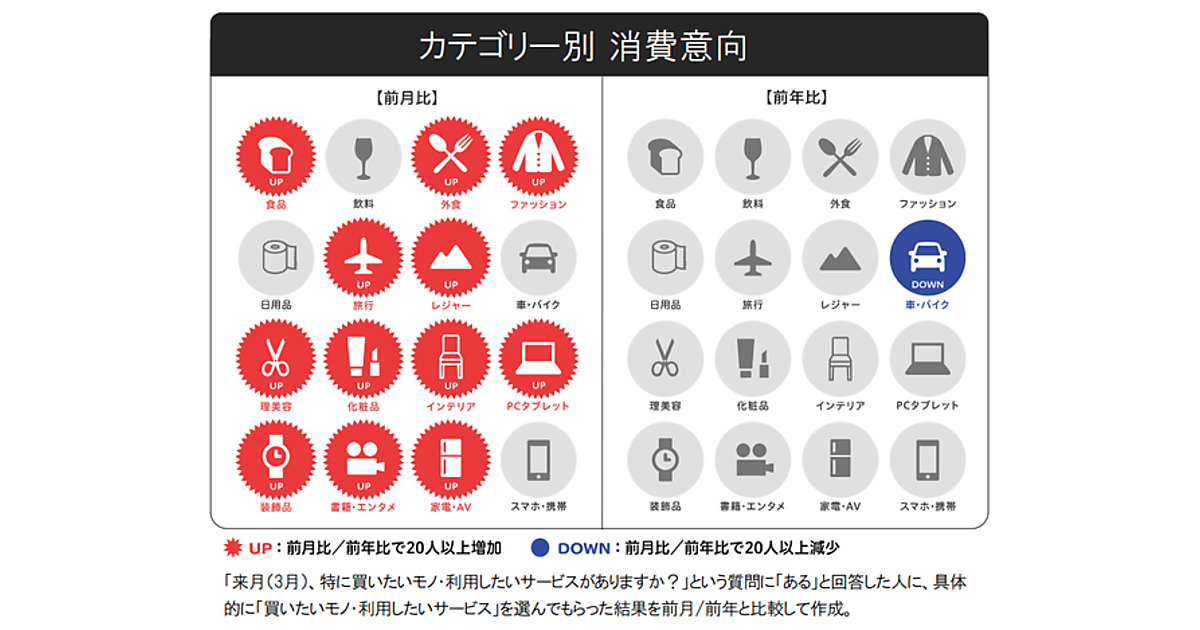 その結果、3月の消費意欲指数は「45.1点」。“季節の変わり目”である3月は、通常は消費意欲が高まるため、2月からは3.7ポイント増加している。具体的な品目では、「車・バイク」以外のほとんどのカテゴリーで、消費意欲が増大している。