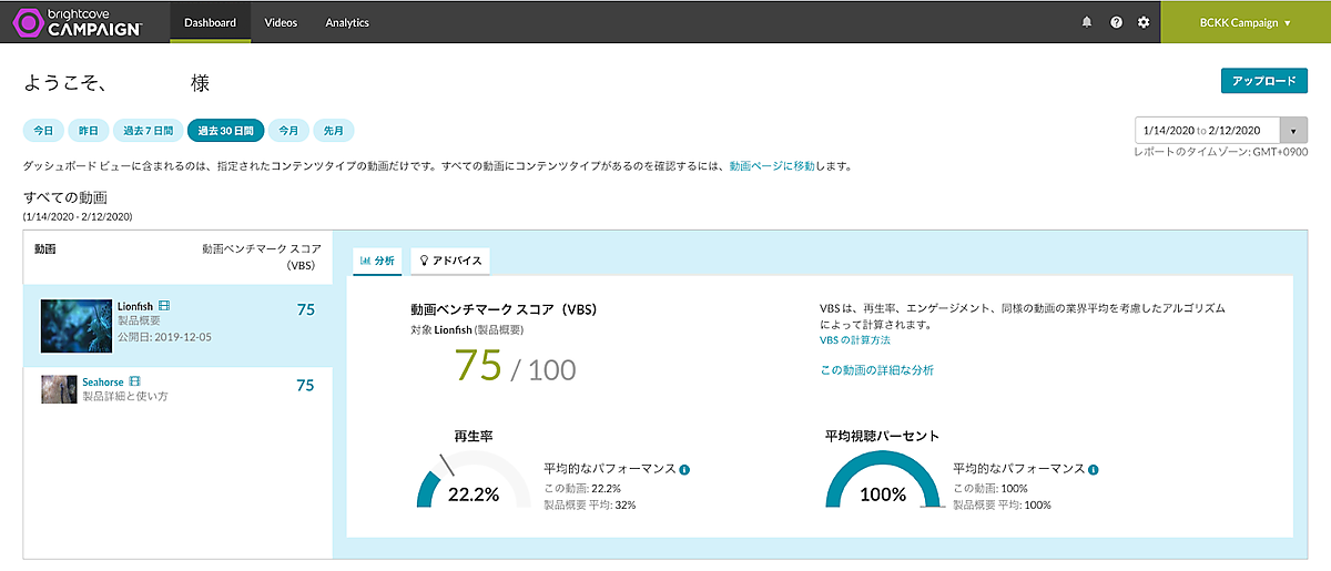 Brightcove Campaignは、まずライバル社の動画と比較して再生率などを診断する「動画ベンチマークスコア」を提供。診断結果をもとに、自社動画のパフォーマンスを改善するため、配信サイトのランディングページやソーシャルメディア展開、動画SEO(検索エンジン最適化)に必要なコードの一括発行、マーケティングオートメーション(MA)ツールやアクセス解析ツールとの連携をアドバイスする。