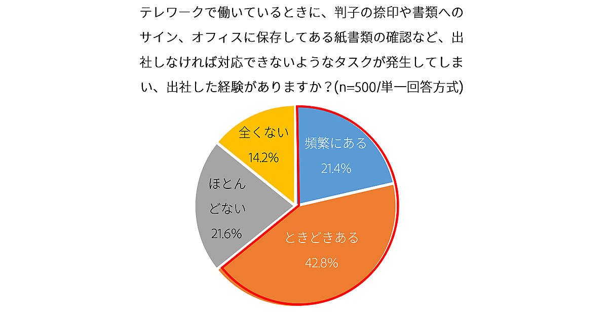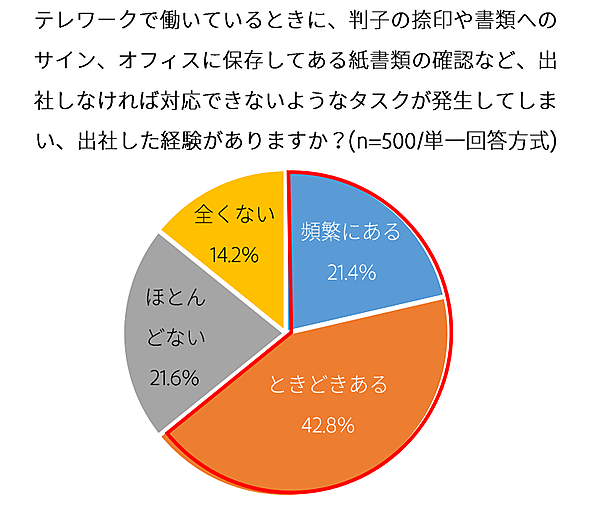 そこで「テレワークで働いているときに、「書類の確認や捺印などでやむなく出社した経験があるか」と聞くと、「頻繁にある」21.4%、「ときどきある」42.8%と合わせ、6割以上がテレワーク中にやむなく出社した経験を持っていた。なお「テレワークを実施してペーパーレス化が進んだか」を聞いたところ、84.8%が「ペーパーレス化が進んだ」と回答しているため、こうした“紙のボトルネック”は今後、相乗効果で駆逐されそうだ。