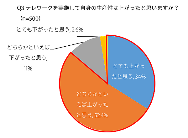まず「テレワークを実施して、自身の生産性は上がったと思うか」を聞くと、「とても上がったと思う」34.0%、「どちらかといえば上がったと思う」52.4%で、9割近い人が「生産性が上がった」と感じていた。