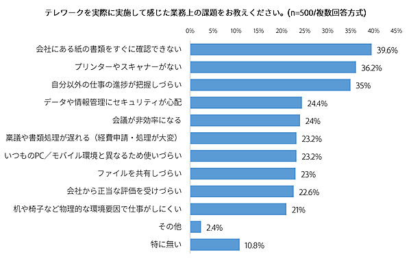 次に「テレワークを実施して感じた業務上の課題」を聞くと、「会社にある紙の書類を確認できない」39.6%、「プリンターやスキャナーがない」36.2%、「自分以外の仕事の進捗が把握しづらい」35%が上位で、“紙”が業務のボトルネックになっていることが感じられる。