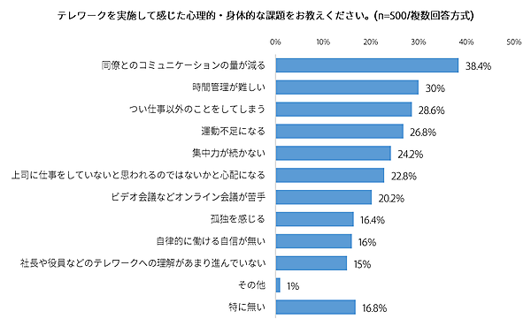2、3位は自己管理の部分だが、こと同僚とのコミュニケーションとなると、チャットやビデオ会議ではなかなか埋めづらい部分がある。このへんは会社側の制度の洗練、テレワークサービスの内容・機能アップでの補完が期待される。