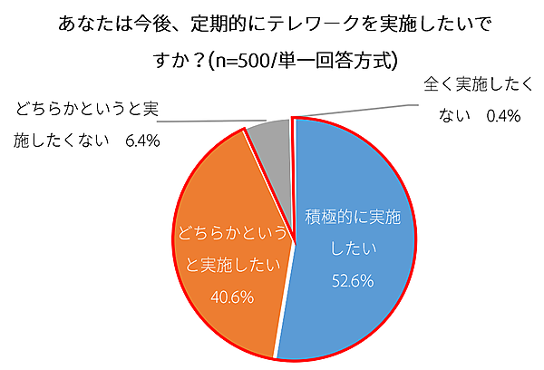 最後に「今後、定期的にテレワークを実施したいか」を聞くと、「積極的に実施したい」52.6%、「どちらかというと実施したい」40.6%で、93.2%が継続の意向を示している。もともと2020年は、東京オリンピック・パラリンピックでの交通渋滞とそれにともなうテレワーク移行の可能性が指摘されていた。今後、さらにテレワークが普及しそうだ。