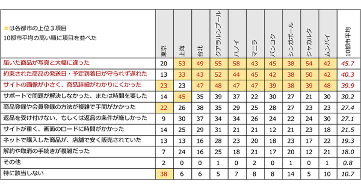 3位はほぼ3つに分かれており、東京、台北、クアラルンプール、ハノイ、バンコク、ジャカルタ、ムンバイは「即日配送サービス」25.1%、上海、台北、クアラルンプール、マニラ、シンガポールは「商品の口コミの充実」24.5%、上海とムンバイは「自己都合による商品の返品対応」19.0%が、それぞれ位置している。