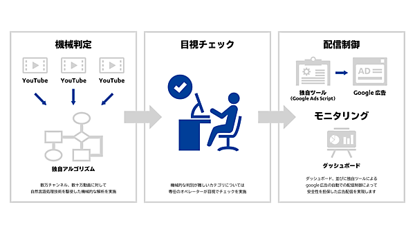 日本でもYouTubeを主要な広告配信先にする広告主、広告代理店が多い半面、YouTubeにはユーザーが投稿したさまざまな動画があり、不適切なコンテンツの除外ができない状況なっていることから、開発した。機械的な判定アルゴリズムに加え、専任オペレーターの目視という2段階のチェックでリストを精査して精度を高める。