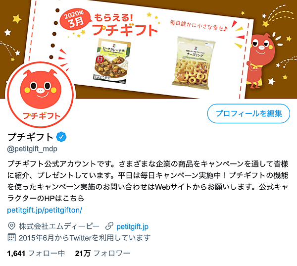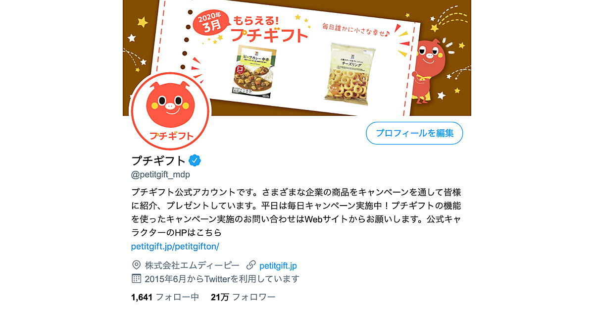 法人向けeギフト基盤事業のエムディーピー(MDP)は、同社が展開するeギフト発行・配布サービス「プチギフト」の「Twitter」公式アカウントのフォロワー数が20万人を超えた、と3月10日発表した。アカウントではプチギフトを使った一般向けのeギフト情報を発信し、企業が実施するキャンペーンの告知媒体になっている。