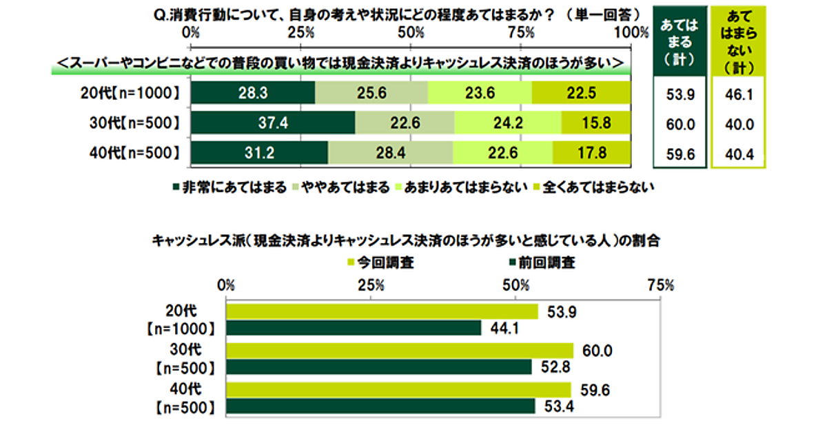 利用者の増加では、20代が前回44.1%→今回53.9%、30代が前回52.8%→今回60.0%、40代が前回53.4%→今回59.6%で、20代の増加が目立ったが、もともと30代・40代のほうがキャッシュレスが強かった模様。