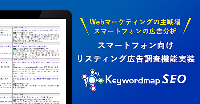 ウェブマーケティング・ソリューション事業のCINC(シンク)は、同社のウェブマーケティング戦略の調査分析ツール「Keywordmap(キーワードマップ)for SEO」に、検索ワードに最適化したテキストをスマートフォンの検索結果画面に掲載するリスティング広告の調査機能を実装した、と3月18日に発表した。スマホ検索の国内市場の動向把握やライバル社の戦略分析に活用できる。