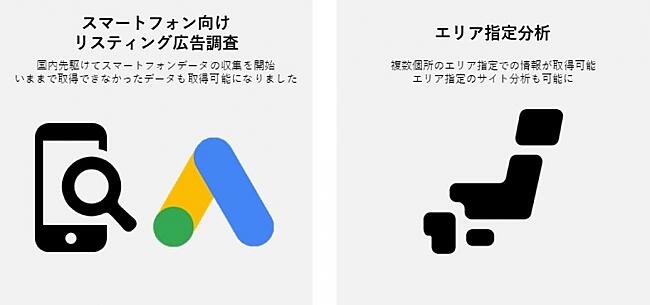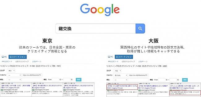 スマホに配信されるリスティング広告に特化したSERPs(Search Engine Result Pages)=検索結果ページ=のデータによって、従来のパソコンデータで分からなかったスマホ向け広告の分析が可能になる。「東京」「大阪」などとエリア指定し、広告配信キーワード▽出稿先ドメイン・サイト情報▽広告クリエイティブ▽想定広告出稿費が調べられる。